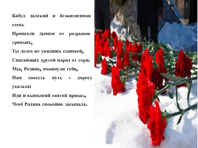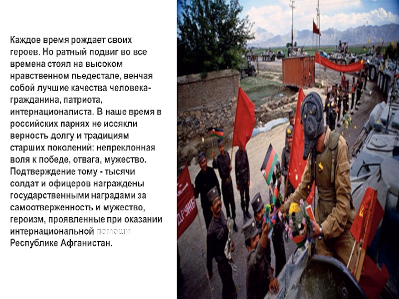 Рядовые, офицеры, генералы с честью, а зачастую и ценой собственной жизни, выполняли приказ Родины. На протяжении 10 лет на территории Афганистана наши военнослужащие и гражданские специалисты не только вели боевые действия, но и строили дороги, школы, больницы, оказывали гуманитарную и медицинскую помощь местному населению.