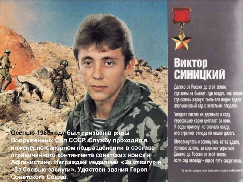 Слайд 7Осенью 1985 года был призван в ряды Вооруженных Сил СССР. Службу