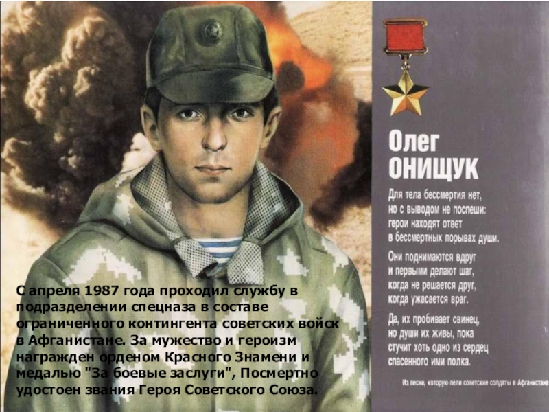 Слайд 13С апреля 1987 года проходил службу в подразделении спецназа в составе