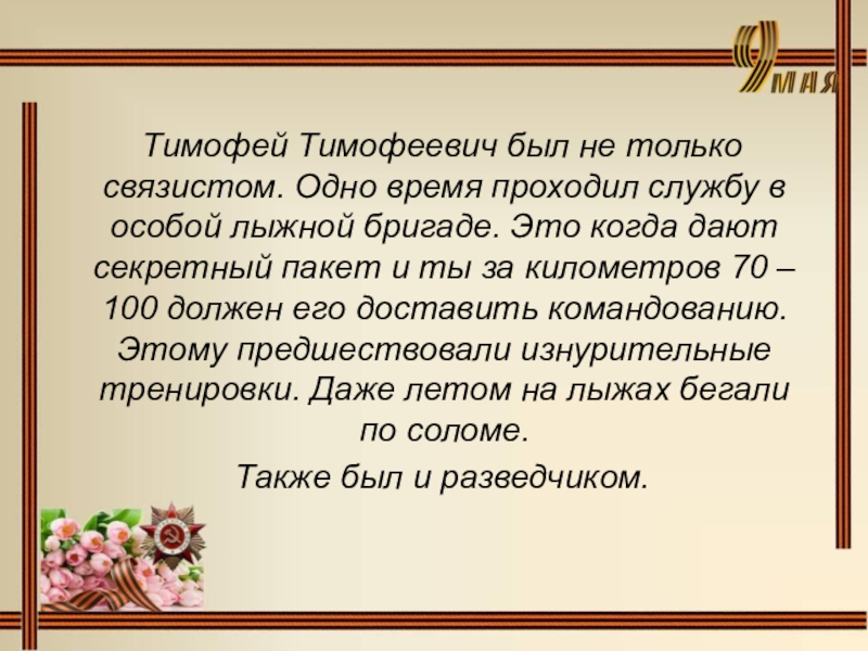 Слайд 15 Тимофей Тимофеевич был не только связистом. Одно время проходил