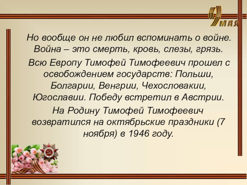 Слайд 16 Но вообще он не любил вспоминать о войне. Война