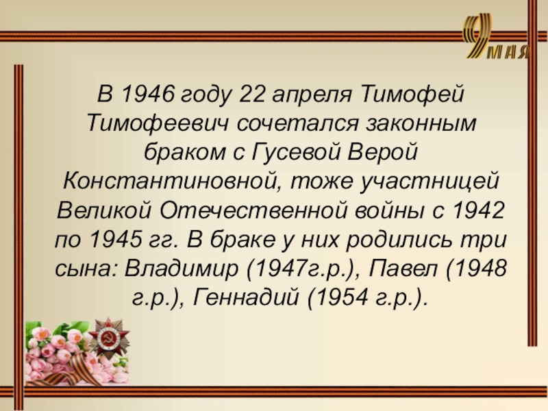 Слайд 22 В 1946 году 22 апреля Тимофей Тимофеевич сочетался законным