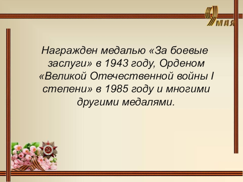 Слайд 18 Награжден медалью «За боевые заслуги» в 1943 году, Орденом «Великой