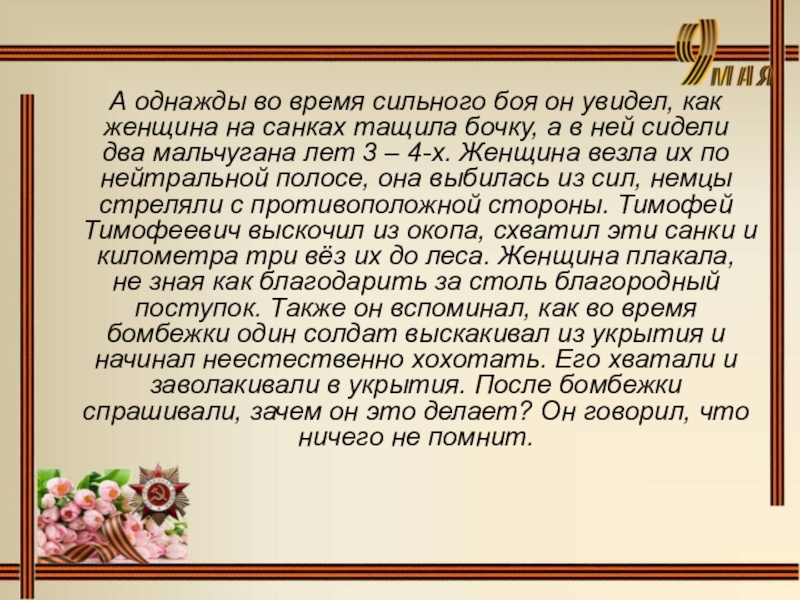 женщина на санках тащила бочку, а в ней сидели два мальчугана лет 3 – 4-х. Женщина везла их по нейтральной полосе, она выбилась из сил, немцы стреляли с противоположной стороны. Тимофей Тимофеевич выскочил из окопа, схватил эти санки и километра три вёз их до леса. Женщина плакала, не зная как благодарить за столь благородный поступок. Также он вспоминал, как во время бомбежки один солдат выскакивал из укрытия и начинал неестественно хохотать. Его хватали и заволакивали в укрытия. После бомбежки спрашивали, зачем он это делает? Он говорил, что ничего не помнит.