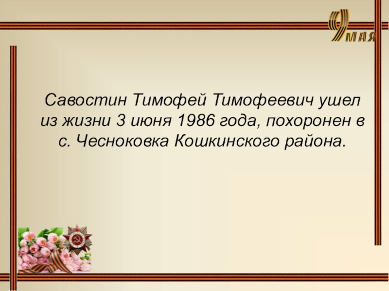 Слайд 24 Савостин Тимофей Тимофеевич ушел из жизни 3 июня 1986