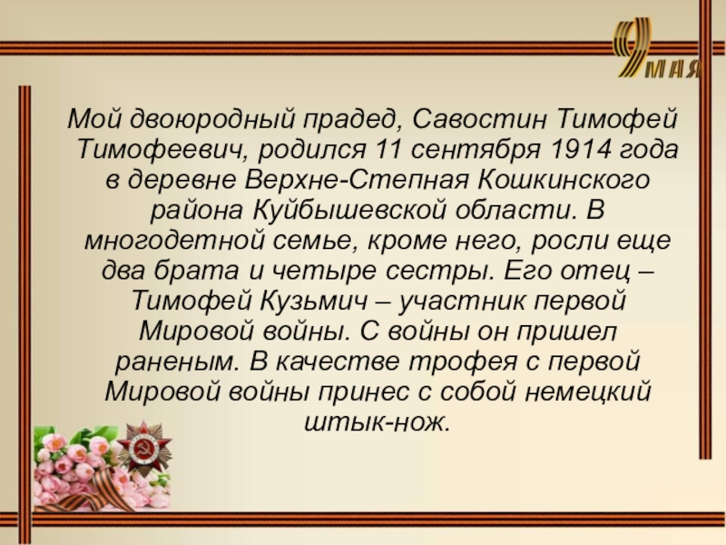 Слайд 4 Мой двоюродный прадед, Савостин Тимофей Тимофеевич, родился 11 сентября 1914