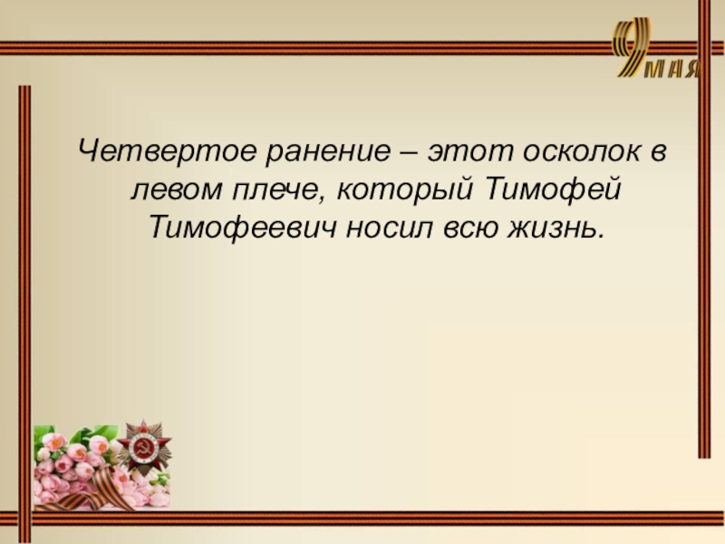 Слайд 12 Четвертое ранение – этот осколок в левом плече, который Тимофей
