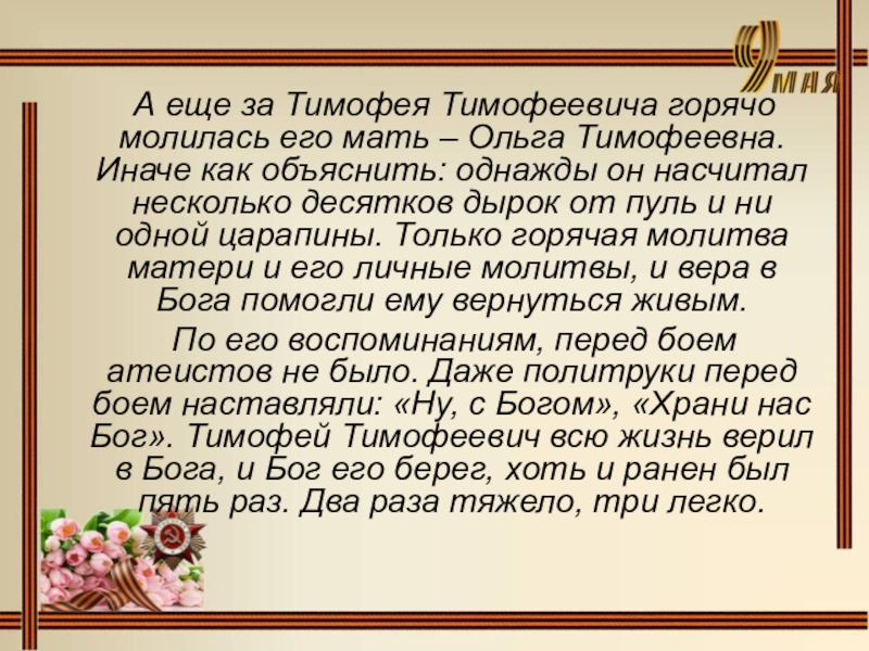 По его воспоминаниям, перед боем атеистов не было. Даже политруки перед боем наставляли: «Ну, с Богом», «Храни нас Бог». Тимофей Тимофеевич всю жизнь верил в Бога, и Бог его берег, хоть и ранен был пять раз. Два раза тяжело, три легко.