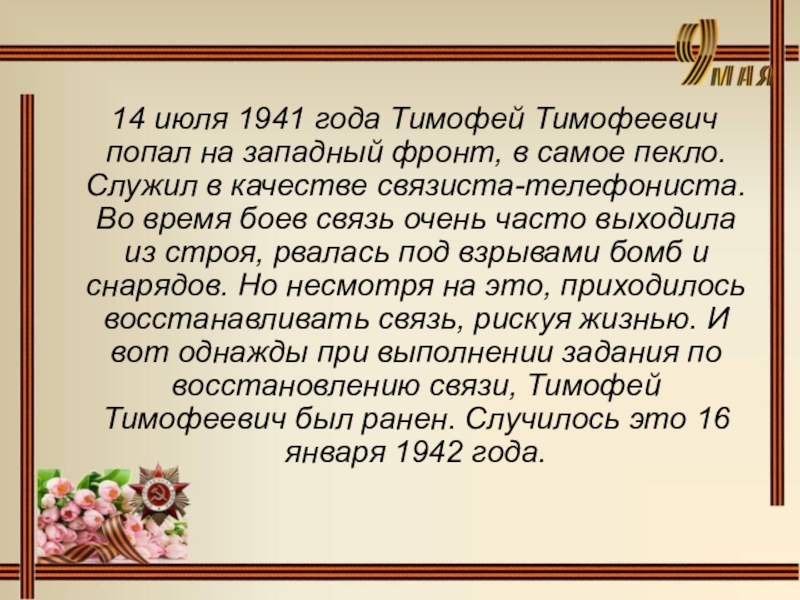 фронт, в самое пекло. Служил в качестве связиста-телефониста. Во время боев связь очень часто выходила из строя, рвалась под взрывами бомб и снарядов. Но несмотря на это, приходилось восстанавливать связь, рискуя жизнью. И вот однажды при выполнении задания по восстановлению связи, Тимофей Тимофеевич был ранен. Случилось это 16 января 1942 года.