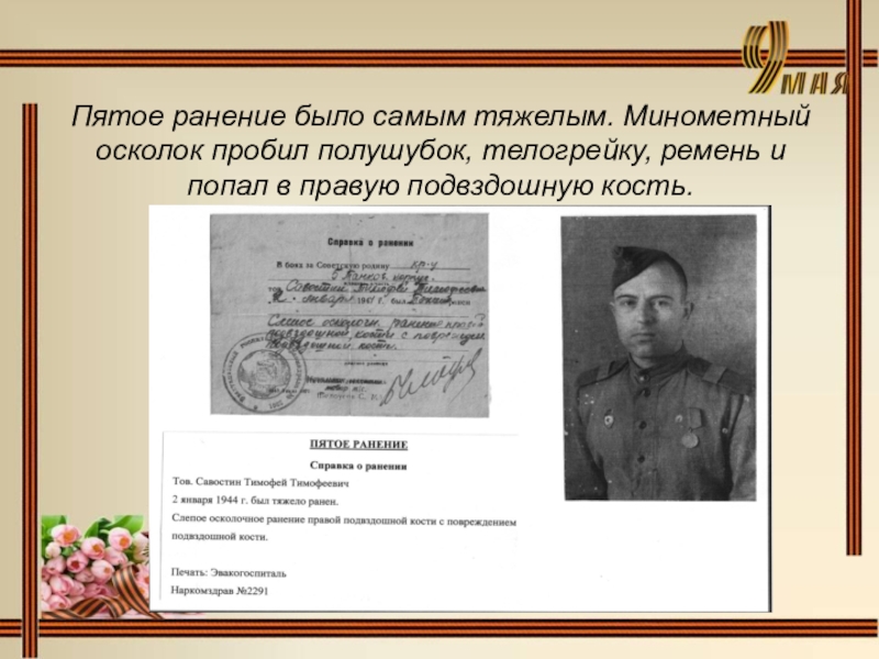 Слайд 14Пятое ранение было самым тяжелым. Минометный осколок пробил полушубок, телогрейку, ремень