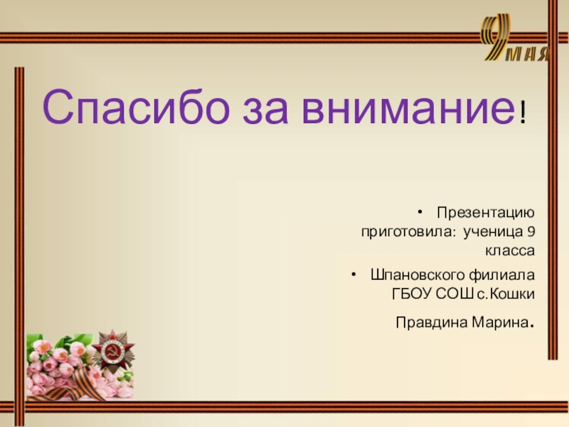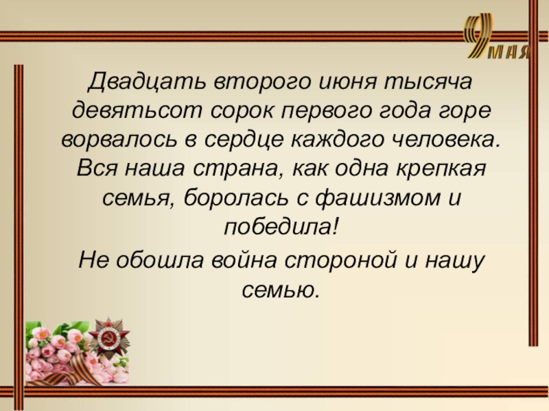 ворвалось в сердце каждого человека. Вся наша страна, как одна крепкая семья, боролась с фашизмом и победила!