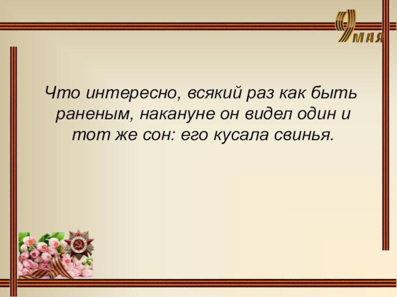 Слайд 9 Что интересно, всякий раз как быть раненым, накануне он видел