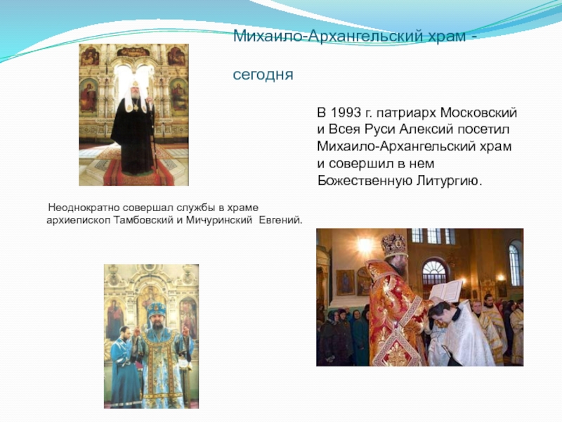 В 1993 г. патриарх Московский и Всея Руси Алексий посетил Михаило-Архангельский храм и совершил в нем Божественную Литургию.
