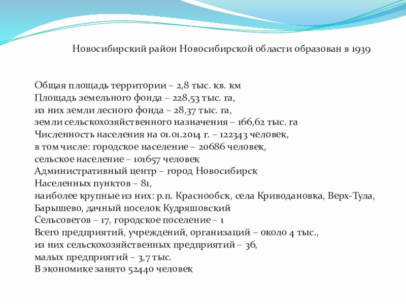 Новосибирский район Новосибирской области образован в 1939  ​Общая площадь территории – 2,8 тыс. кв. кмПлощадь земельного фонда – 228,53 тыс. га,из них земли лесного фонда – 28,37 тыс. га,земли