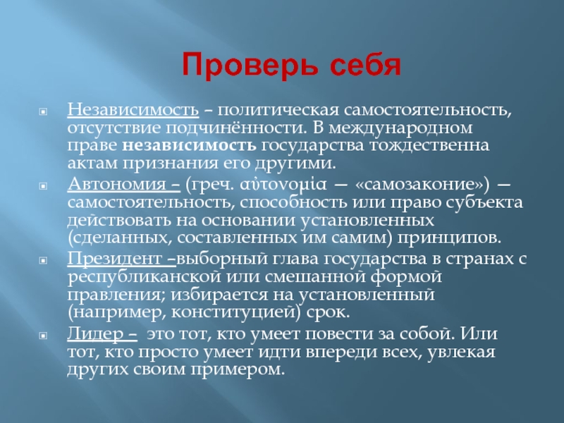 Независимость – политическая самостоятельность, отсутствие подчинённости. В международном праве независимость государства тождественна