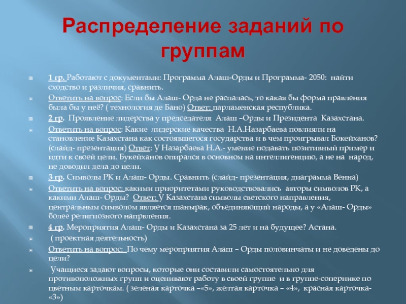 Ответить на вопрос: Какие лидерские качества Н.А.Назарбаева повлияли на становление Казахстана как состоявшегося государства и в чем проигрывал Бокейханов? (слайд- презентация) Ответ: У Назарбаева Н.А.- умение подавать позитивный пример и идти к своей цели. Букейханов опирался в основном на интеллигенцию, а не на народ, не доводил дела до цели.