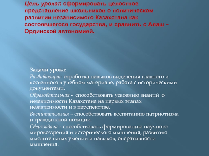 Слайд 2Цель урока:: сформировать целостное представление школьников о политическом развитии независимого Казахстана
