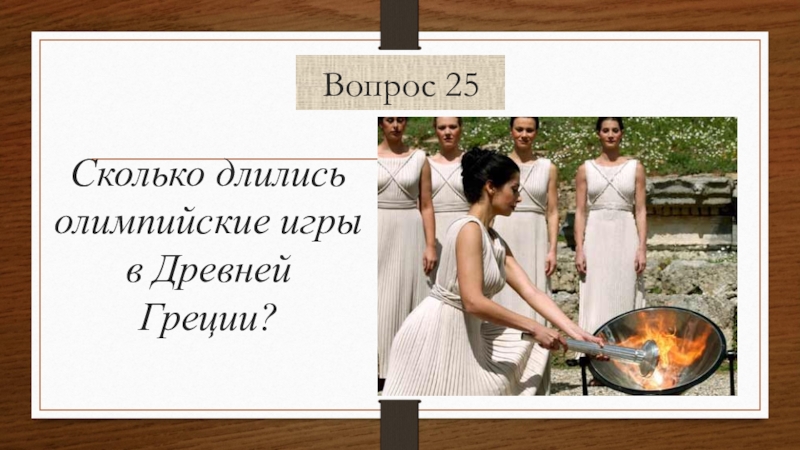 Вопрос 25Сколько длились олимпийские игры в Древней Греции?