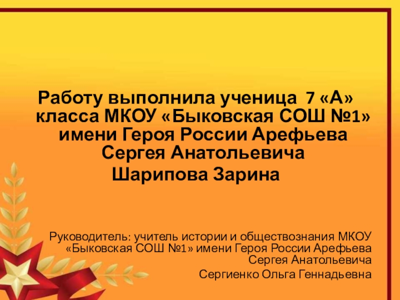 Работу выполнила ученица 7 «А»класса МКОУ «Быковская СОШ №1» имени Героя России Арефьева Сергея АнатольевичаШарипова ЗаринаРуководитель: учитель истории и обществознания МКОУ «Быковская СОШ №1» имени Героя России Арефьева Сергея АнатольевичаСергиенко Ольга Геннадьевна