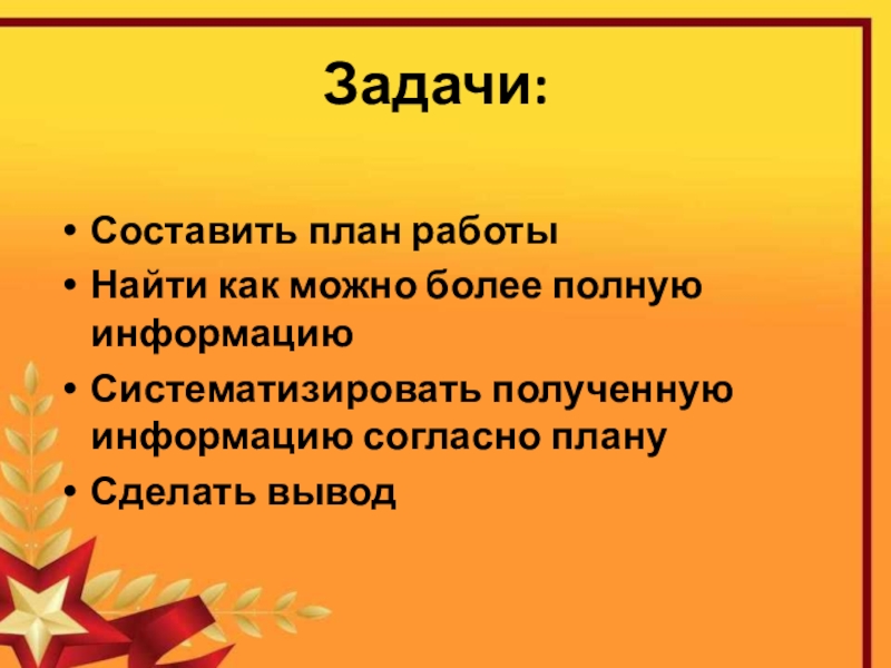 Задачи:  Составить план работыНайти как можно более полную информациюСистематизировать полученную информацию согласно плануСделать вывод