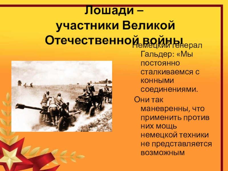 Лошади –  участники Великой Отечественной войныНемецкий генерал Гальдер: «Мы постоянно сталкиваемся с конными соединениями. Они так