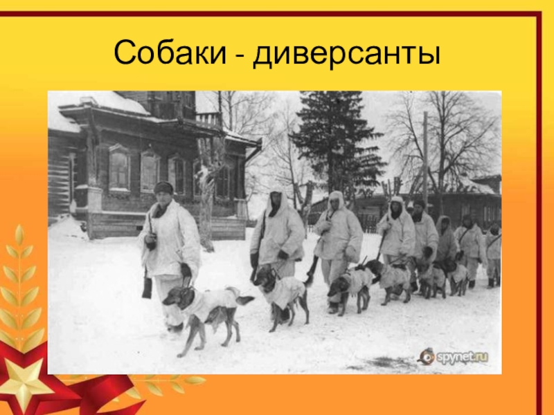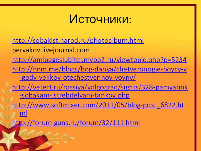 Источники:http://sobakist.narod.ru/photoalbum.htmlpervakov.livejournal.comhttp://amlpageslubitel.mybb2.ru/viewtopic.php?p=5234http://nnm.me/blogs/bog-danya/chetveronogie-boycy-v-gody-velikoy-otechestvennoy-voyny/http://vetert.ru/rossiya/volgograd/sights/328-pamyatnik-sobakam-istrebitelyam-tankov.phphttp://www.softmixer.com/2011/05/blog-post_6822.htmlhttp://forum.guns.ru/forum/32/111.html