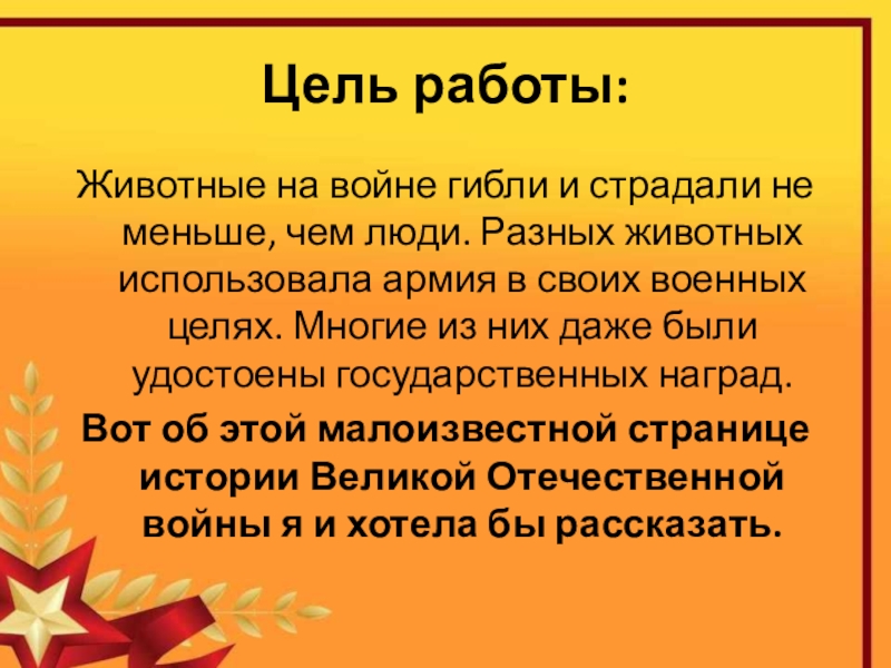 Цель работы:Животные на войне гибли и страдали не меньше, чем люди. Разных животных использовала армия в своих