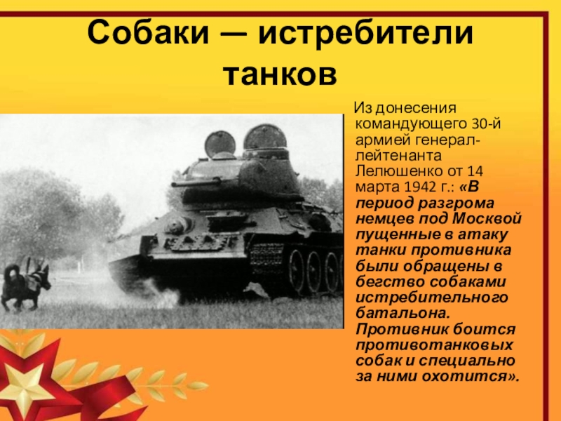 30-й армией генерал-лейтенанта Лелюшенко от 14 марта 1942 г.: «В период разгрома немцев под Москвой пущенные в атаку танки противника были обращены в бегство собаками истребительного батальона. Противник боится противотанковых собак и специально за ними охотится».