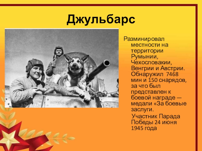ДжульбарсРазминировал местности на территории Румынии, Чехословакии, Венгрии и Австрии. Обнаружил 7468 мин и 150 снарядов, за что