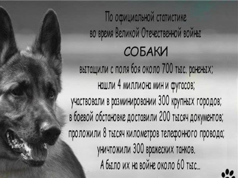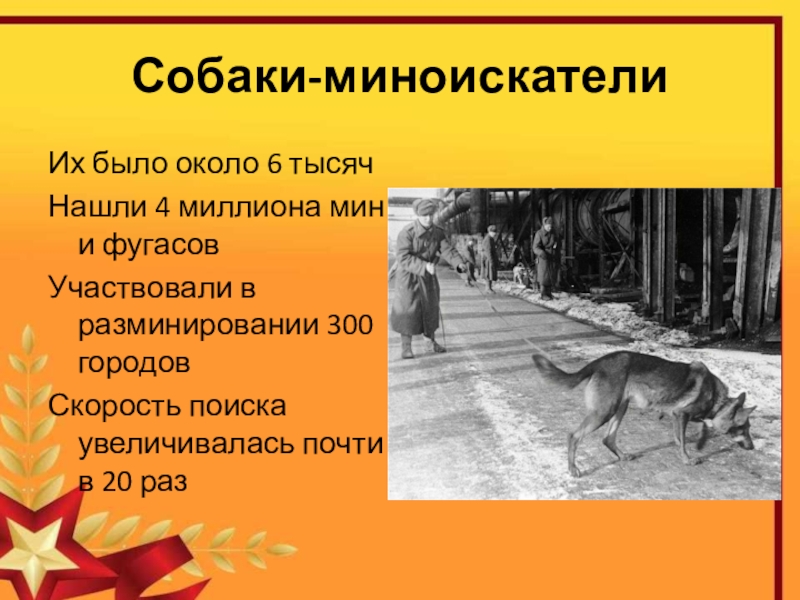 Собаки-миноискателиИх было около 6 тысячНашли 4 миллиона мин и фугасовУчаствовали в разминировании 300 городовСкорость поиска увеличивалась почти