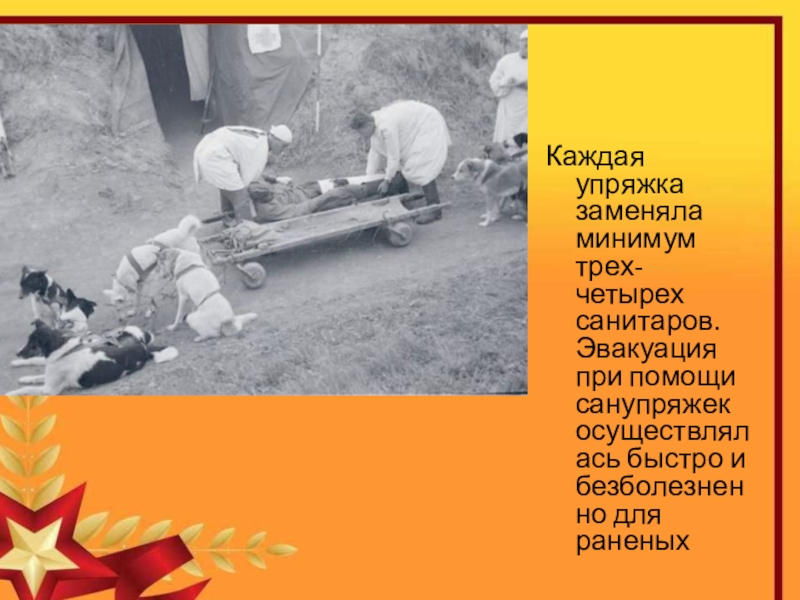 Слайд 18Каждая упряжка заменяла минимум трех-четырех санитаров. Эвакуация при помощи санупряжек осуществлялась