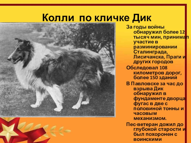 Колли по кличке Дик За годы войны обнаружил более 12 тысяч мин, принимал участие в