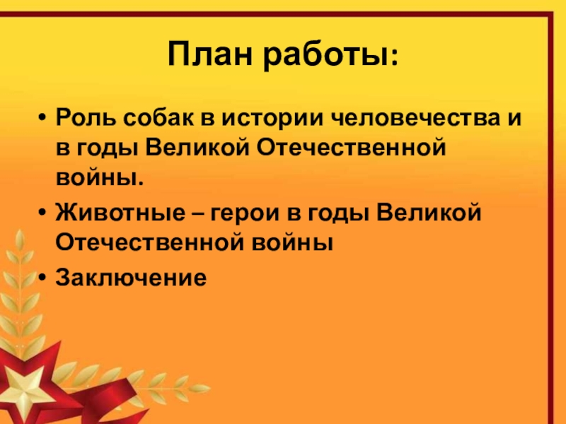 План работы:Роль собак в истории человечества и в годы Великой Отечественной войны.Животные – герои в годы Великой