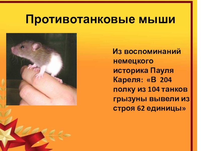 Противотанковые мыши  Из воспоминаний немецкого историка Пауля Кареля: «В 204 полку из 104 танков грызуны вывели