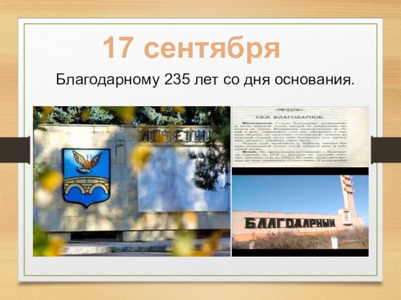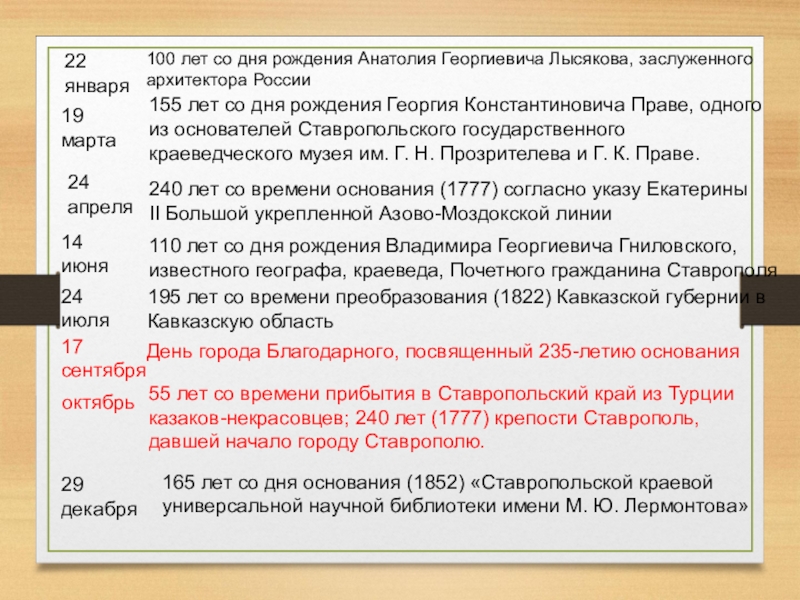 55 лет со времени прибытия в Ставропольский край из Турции казаков-некрасовцев; 240 лет (1777) крепости Ставрополь, давшей начало городу Ставрополю.