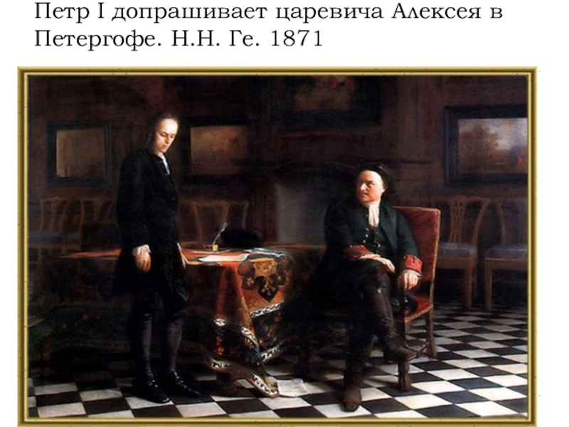 Слайд 23Петр I допрашивает царевича Алексея в Петергофе. Н.Н. Ге. 1871