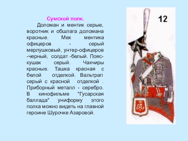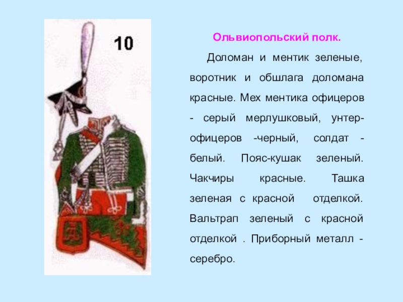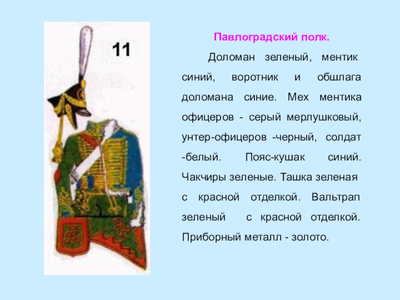 Слайд 11 Мундир Александрийского гусарского полка. Ментик, доломан и чакчиры Александрийцев