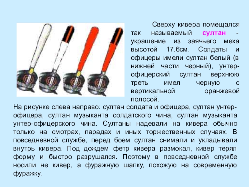 музыканта солдатского чина, султан музыканта унтер-офицерского чина. Султаны надевали на кивера обычно только на смотрах, парадах и иных торжественных случаях. В повседневной службе, перед боем султан снимали и укладывали внутрь кивера. Под дождем фетр кивера размокал, кивер терял форму и быстро разрушался. Поэтому в повседневной службе носили не кивер, а фуражную шапку, похожую на современную фуражку.