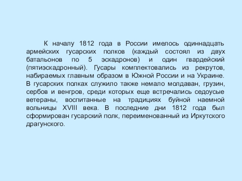 гусарских полков (каждый состоял из двух батальонов по 5 эскадронов) и один гвардейский (пятиэскадронный). Гусары комплектовались из рекрутов, набираемых главным образом в Южной России и на Украине. В гусарских полках служило также немало молдаван, грузин, сербов и венгров, среди которых еще встречались седоусые ветераны, воспитанные на традициях буйной наемной вольницы XVIII века. В последние дни 1812 года был сформирован гусарский полк, переименованный из Иркутского драгунского.