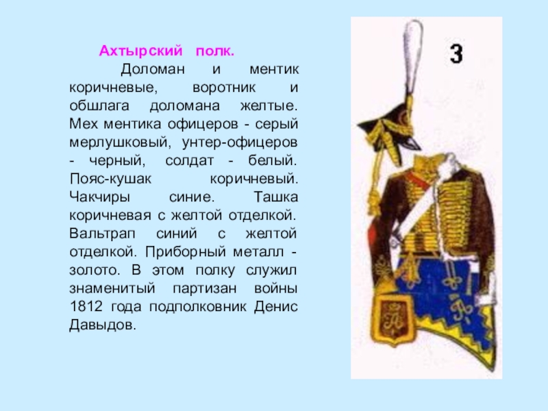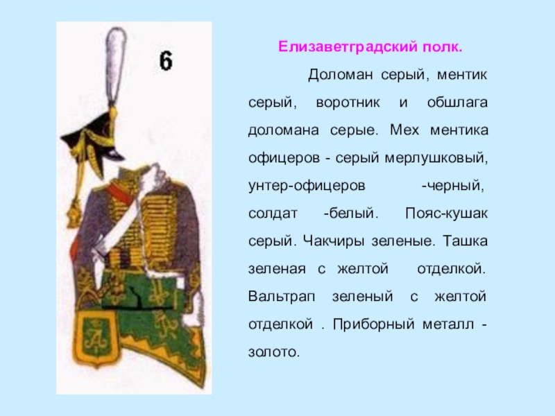 воротник и обшлага доломана желтые. Мех ментика офицеров - серый мерлушковый, унтер-офицеров - черный, солдат - белый. Пояс-кушак коричневый. Чакчиры синие. Ташка коричневая с желтой отделкой. Вальтрап синий с желтой отделкой. Приборный металл - золото. В этом полку служил знаменитый партизан войны 1812 года подполковник Денис Давыдов.
