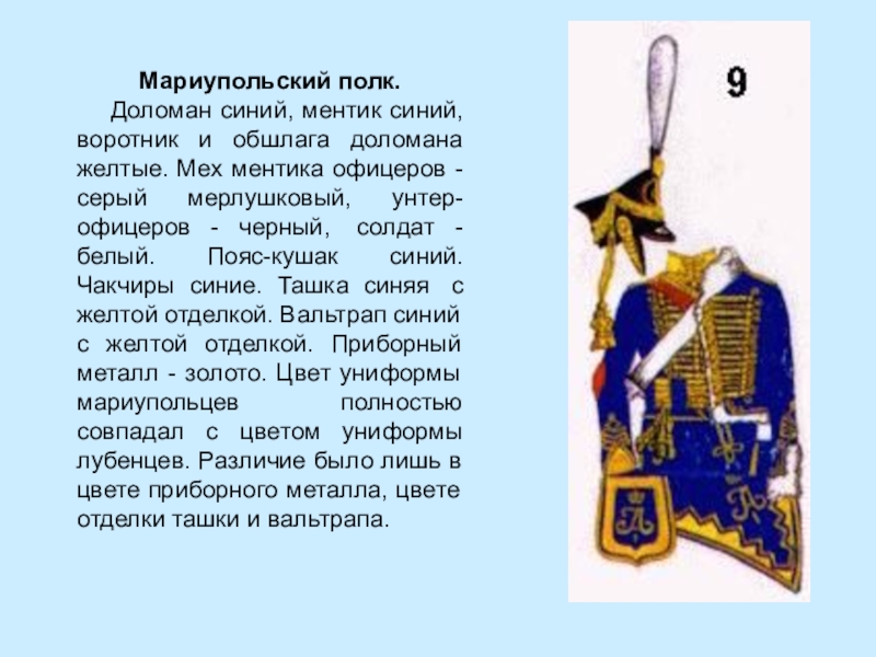 желтые. Мех ментика офицеров - серый мерлушковый, унтер-офицеров - черный, солдат -белый. Пояс-кушак синий. Чакчиры синие. Ташка синяя с желтой отделкой. Вальтрап синий с желтой отделкой. Приборный металл - золото. Цвет униформы мариупольцев полностью совпадал с цветом униформы лубенцев. Различие было лишь в цвете приборного металла, цвете отделки ташки и вальтрапа.