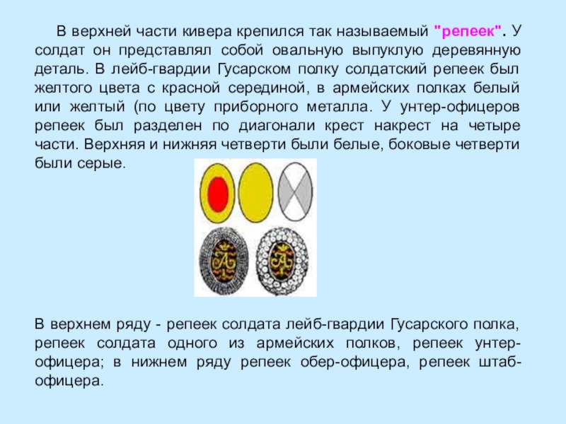 Слайд 7 В верхней части кивера крепился так называемый "репеек".