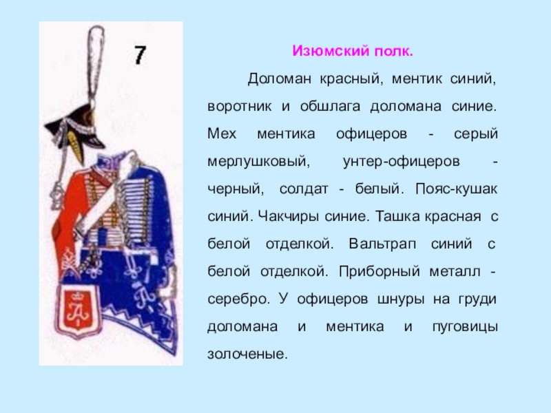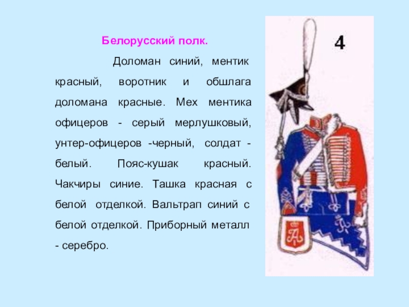 и обшлага доломана красные. Мех ментика офицеров - серый мерлушковый, унтер-офицеров -черный, солдат -белый. Пояс-кушак красный. Чакчиры синие. Ташка красная с белой отделкой. Вальтрап синий с белой отделкой. Приборный металл - серебро.