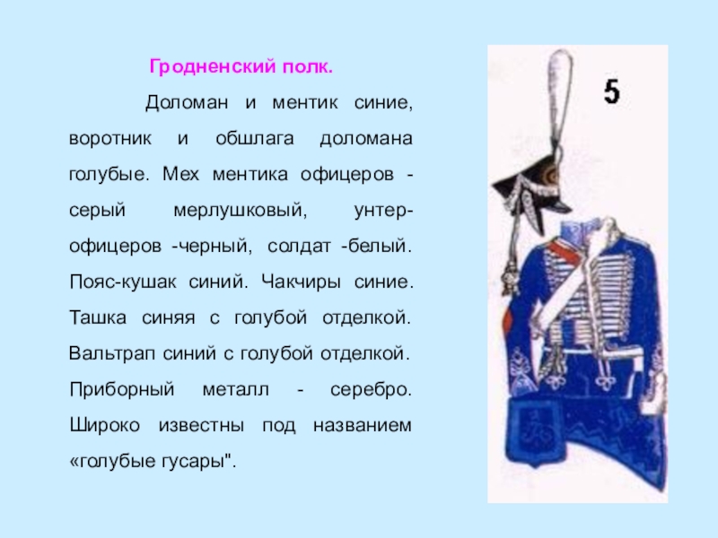 доломана голубые. Мех ментика офицеров - серый мерлушковый, унтер-офицеров -черный, солдат -белый. Пояс-кушак синий. Чакчиры синие. Ташка синяя с голубой отделкой. Вальтрап синий с голубой отделкой. Приборный металл - серебро. Широко известны под названием «голубые гусары".