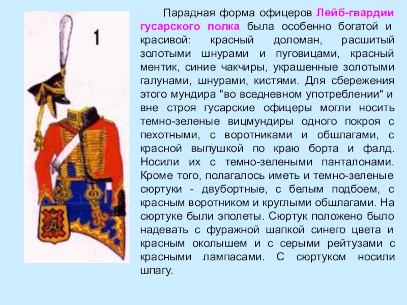 особенно богатой и красивой: красный доломан, расшитый золотыми шнурами и пуговицами, красный ментик, синие чакчиры, украшенные золотыми галунами, шнурами, кистями. Для сбережения этого мундира "во вседневном употреблении" и вне строя гусарские офицеры могли носить темно-зеленые вицмундиры одного покроя с пехотными, с воротниками и обшлагами, с красной выпушкой по краю борта и фалд. Носили их с темно-зелеными панталонами. Кроме того, полагалось иметь и темно-зеленые сюртуки - двубортные, с белым подбоем, с красным воротником и круглыми обшлагами. На сюртуке были эполеты. Сюртук положено было надевать с фуражной шапкой синего цвета и красным околышем и с серыми рейтузами с красными лампасами. С сюртуком носили шпагу.