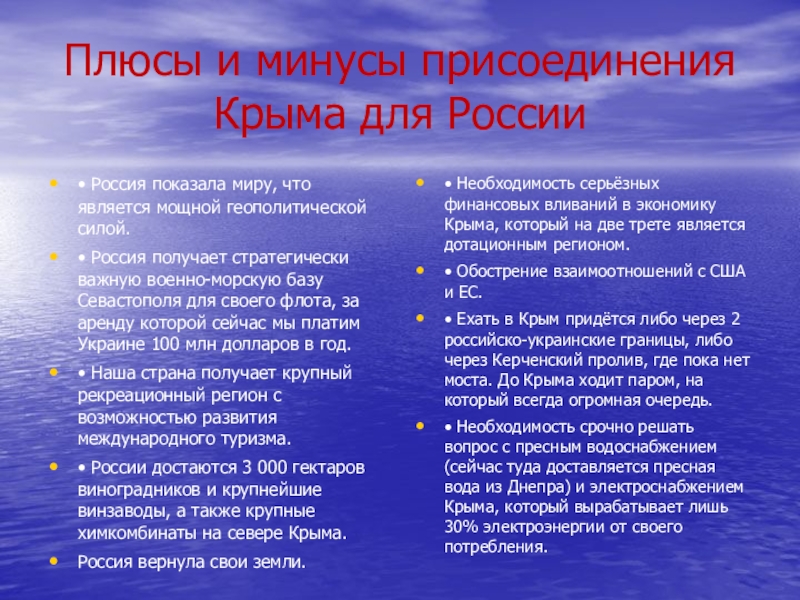 • Необходимость серьёзных финансовых вливаний в экономику Крыма, который на две трете является дотационным регионом.