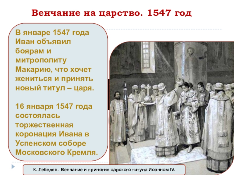В январе 1547 года Иван объявил боярам и митрополиту Макарию, что хочет жениться и принять новый титул – царя.