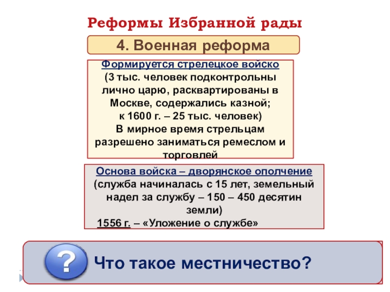 Основа войска – дворянское ополчение (служба начиналась с 15 лет, земельный надел за службу – 150 – 450 десятин земли)