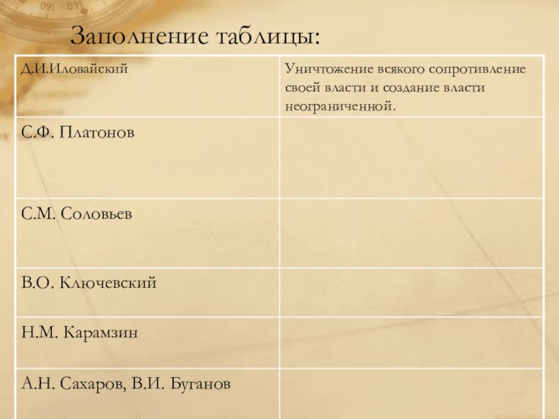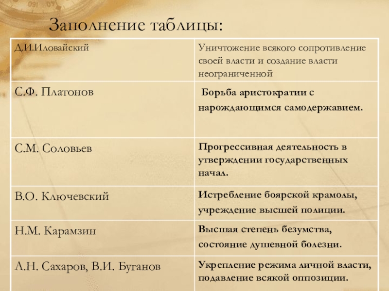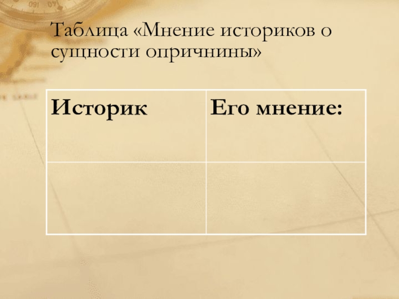 Слайд 27Таблица «Мнение историков о сущности опричнины»