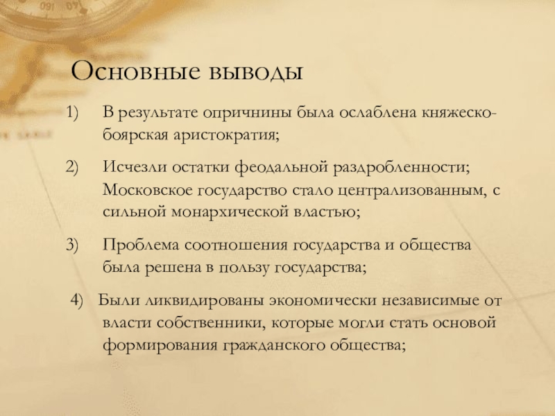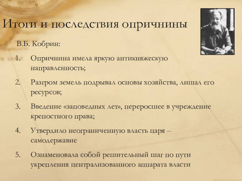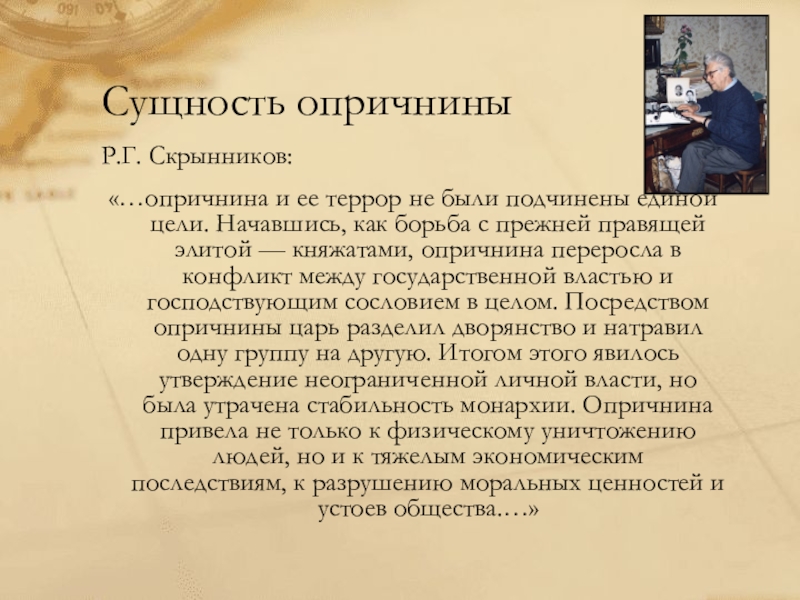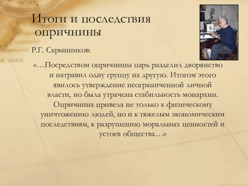 как борьба с прежней правящей элитой — княжатами, опричнина переросла в конфликт между государственной властью и господствующим сословием в целом. Посредством опричнины царь разделил дворянство и натравил одну группу на другую. Итогом этого явилось утверждение неограниченной личной власти, но была утрачена стабильность монархии. Опричнина привела не только к физическому уничтожению людей, но и к тяжелым экономическим последствиям, к разрушению моральных ценностей и устоев общества.…»